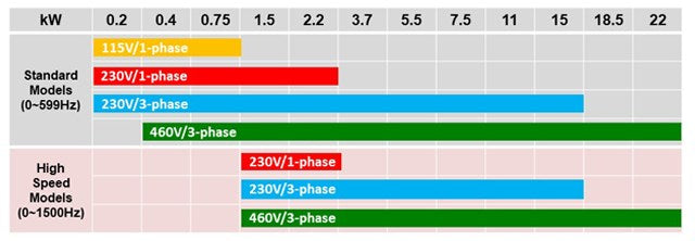 High speed models: 0 to 1500 Hz (V/f Control)